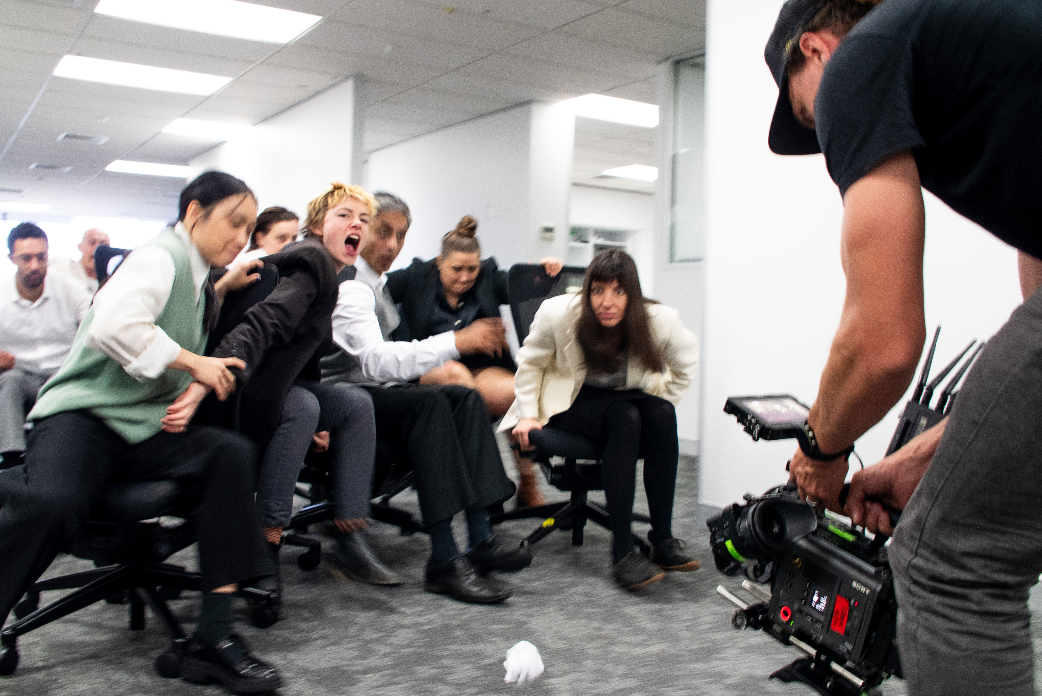 Some of the inspirations for this video were the creepy corporate vibes of Severance and the absurdity of Greenwing. We made the bold choice to shoot mostly handheld with minimal lighting and opting to use the fluorescent lighting at the location. This added to the sickly, uncomfortable tone we wanted to create.