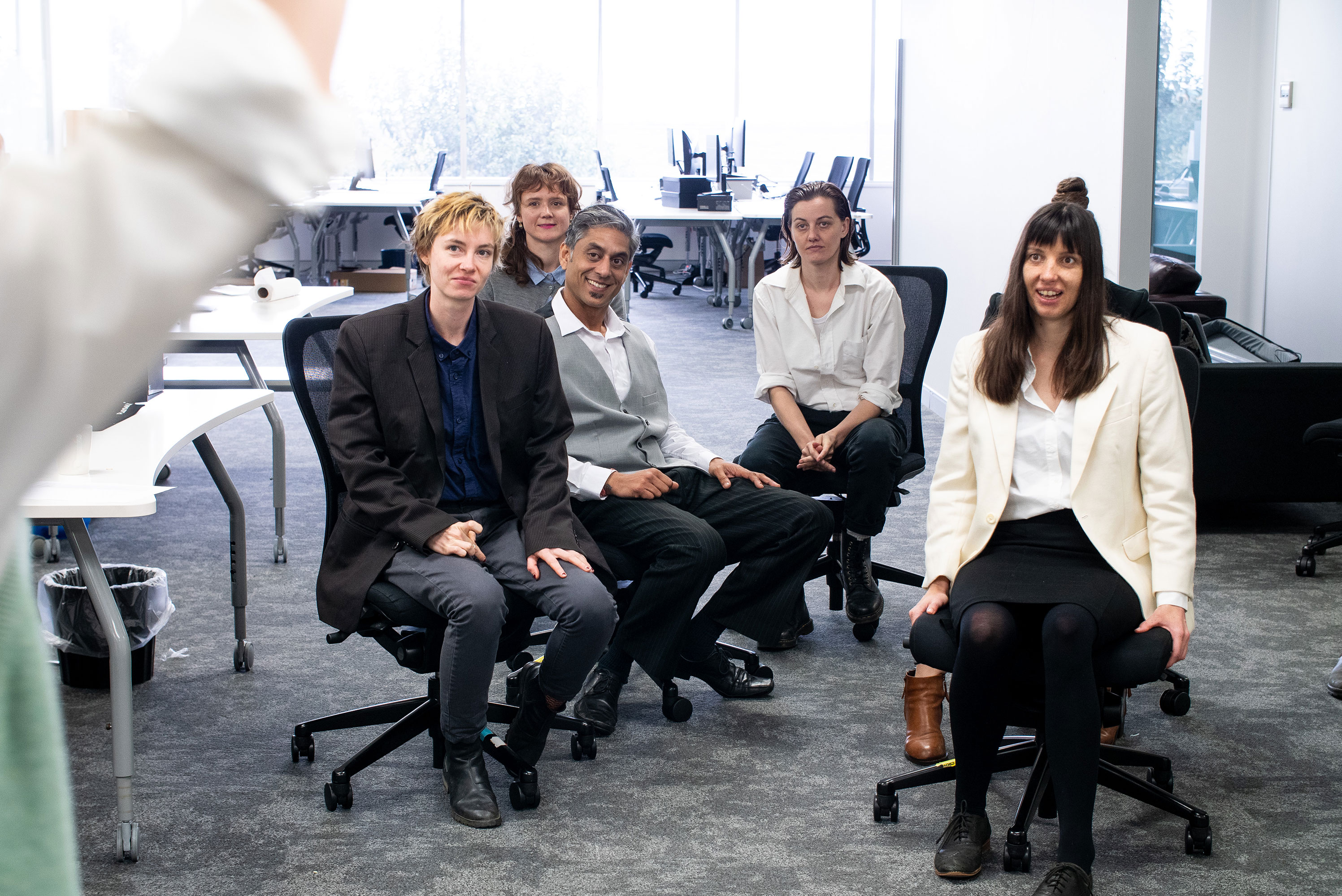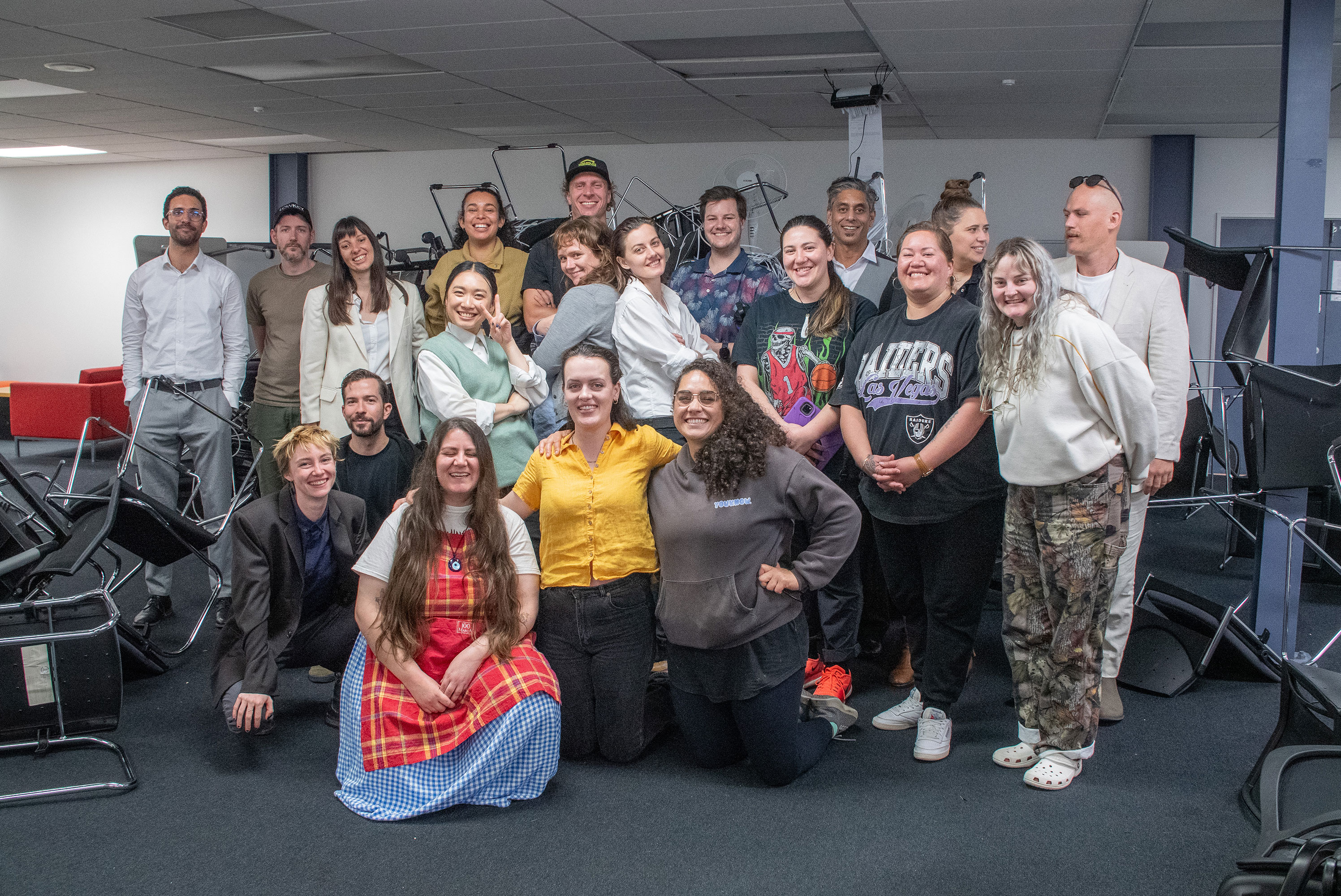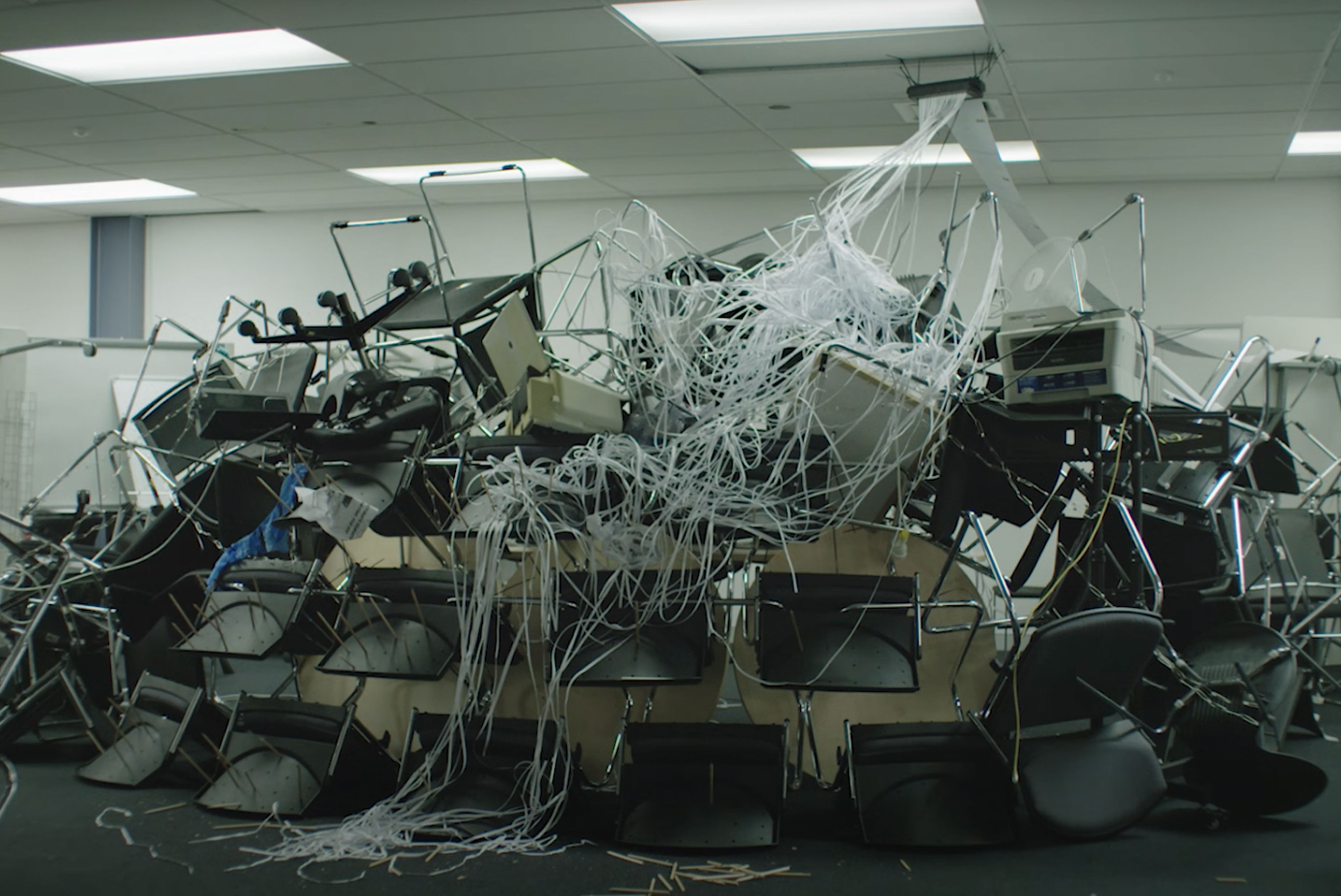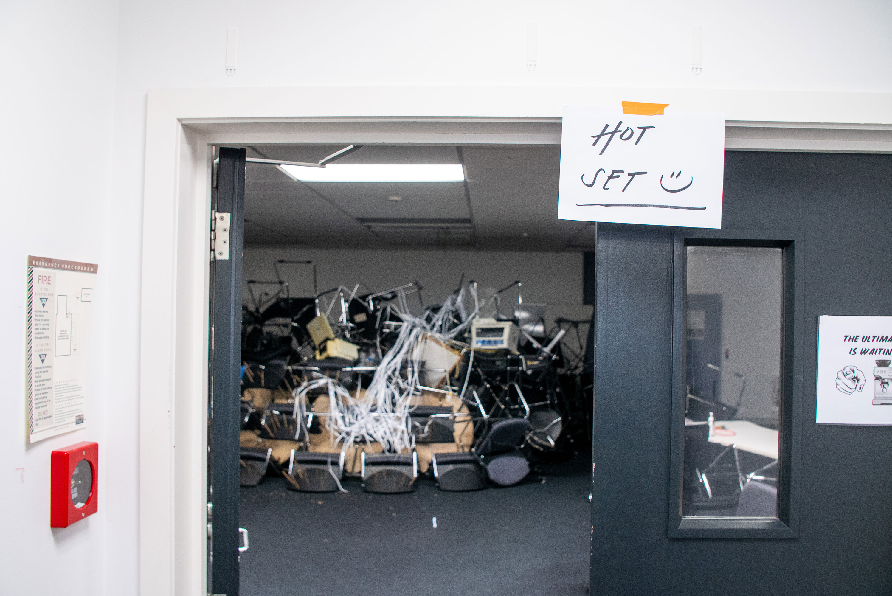 Tameka Vahatu joined us again to build the barrier wall. The level of detail is truly something to behold. Criss-crossed chains of paper clips and safety pins, defunct printers stacked up, and sharpened pencils shoved into every crevice. The icing on the cake was a constantly self-feeding paper shredder rigged to the ceiling showering the barricade with endless paper. Shout out to Click Studios for letting us go ham with all the office bits.